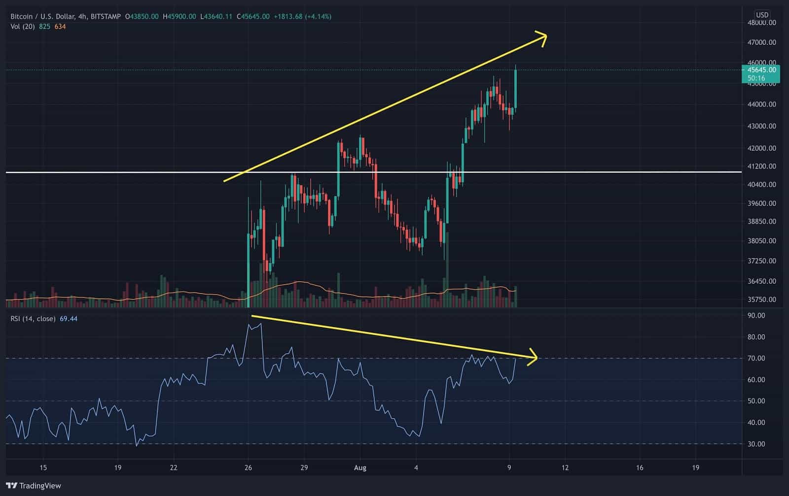Another week – another impressive BTC rally. The cryptocurrency has pushed higher in the past week, at one point making an intraweek high above major resistance at the 21-week moving average and the 200-day moving average. BTC saw some selling pressure heading into the weekly close and went slightly below these 2 critical levels. Near-term technicals on the 4-hour chart signal caution as there is bearish divergence forming. This occurs when the price is trending higher while the relative strength index is trending lower, indicating a near-term risk of consolidation or pullback. Chart by TradingView To invalidate the bearish divergence, BTC needs to break above the recent highs at $45.3k and continue pushing significantly higher to allow the relative strength index to go above the downtrend line. At the time of writing, BTC is attempting to invalidate bearish divergence. This could be an earlier than expected start of another try to break above the 21-week moving average and the 200-day moving average. A successful daily and weekly close above these 2 critical levels will trigger a very strong buy signal, likely opening a new wave of capital into the largest cryptocurrency, pushing prices significantly higher, and perhaps even targeting the coveted $50K mark. Chart by TradingView Earlier today, BTC had a bullish backtest of a rising trend line, previously resistance, now flipping as support. Technical analysts consider this another near-term bullish signal for BTC. With bullish fundamentals, technicals, momentum, sentiment, on-chain signals, the hash ribbon indicator flashing a long-term buy signal, and illiquid supply increasing, the conditions look favorable for a BTC breakout. The week just started, so we will have to see how BTC holds today and going forward. Post navigation Ethereum Will Peak in Less Than 2 Years but Cardano Also Progresses: Charles Hoskinson Ethereum Price Analysis: ETH Holds $3,000 Following 22% Weekly Gains, Here Are Next Possible Targets